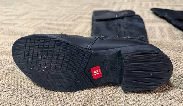 AR AMILA (women’s?) wide-calf, knee-length vinyl and rubber zippered boots, size 10M.