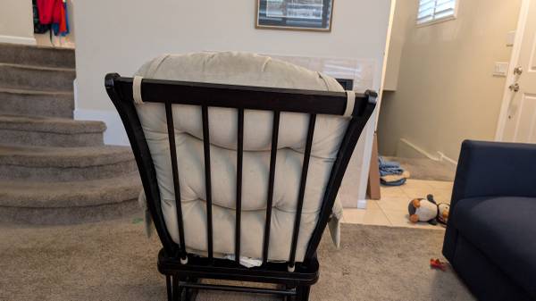 Fabulously comfortable glider rocking chair, great for nursing and bottle feeding and snuggling with babies and toddlers. Perfect condition mechanically: smooth glide, no squeaks. Some small stains...