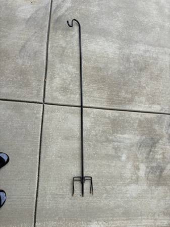 Sheppard's Hook: 5 feet tall. We used this to hang a humming bird feeder. Ants still got to it, so we moved the feeder somewhere else and don't need this anymore. Can be found on Amazon for more info: https://www.amazon.com/dp/B0CB88WCHL?ref_=ppx_hzod_title_dt_b_fed_asin_title_0_0.