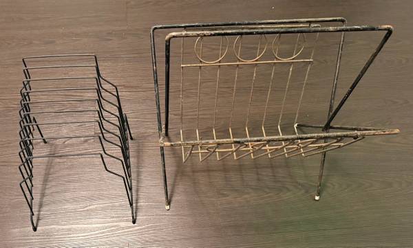 Vintage metal magazine-vinyl record rack and desktop file-media organizer.