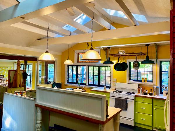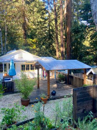 This beautiful 1932 Designer Cottage with stone fireplace has a large private yard, and an organic garden with avocado, peach, plum and apple trees. Also an outdoor studio with large windows and skylights. The cottage sits in a lush tranquil setting on a quiet single lane country road. Features include attractive architectural details, cheerful interior colors, granite and butcher block counters, French windows, skylights, and wood floors. 15-20 min to Santa Cruz, 10 min to Scotts Valley, close to popular high quality restaurants, venues, local boutiques and shops.
