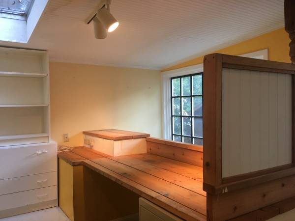 The great room features a glass-front wood stove set in a cozy stone fireplace, along with a gas wall furnace, air conditioner and ceiling fan. There's an office alcove with a large French window and view of the garden, built-in desk top, large drawers, and two-drawer filing cabinet.