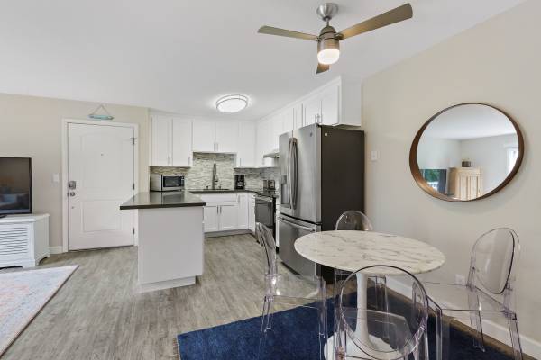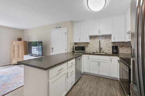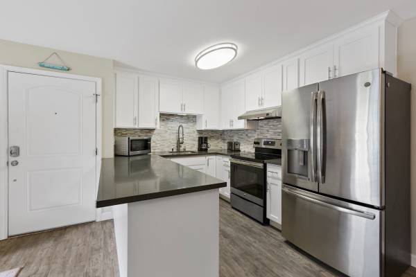 Community poolLarge windowsQuartz countertopsStainless steel appliancesFresh white cabinetsRemodeled kitchenEnd unit condo