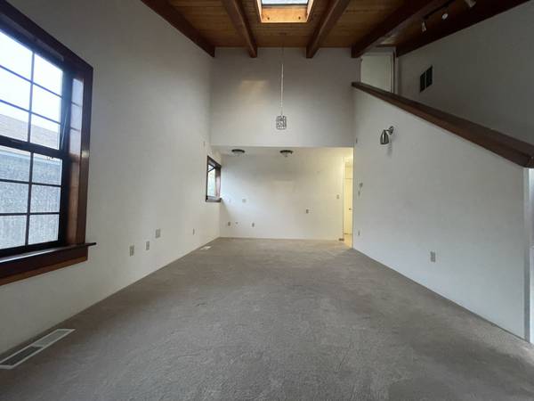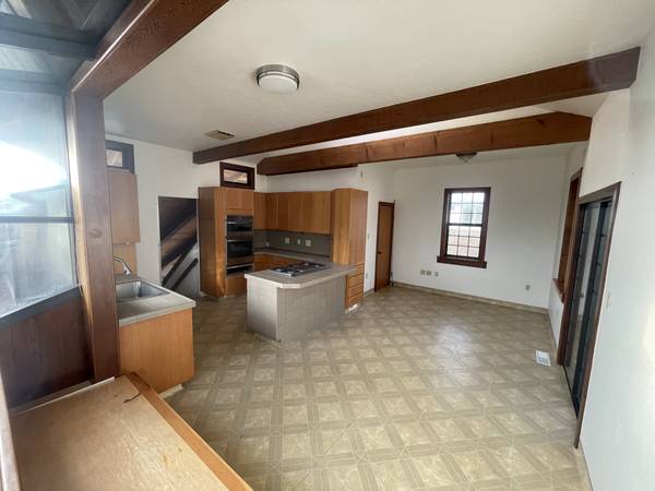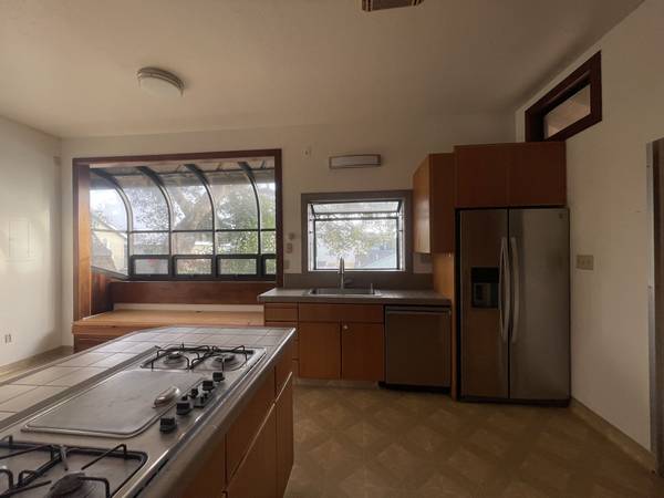 Kitchen is upstairs, offering a great view through a mature oak tree. Multiple skylights, decks; large rooms, interesting neighborhood for walking.