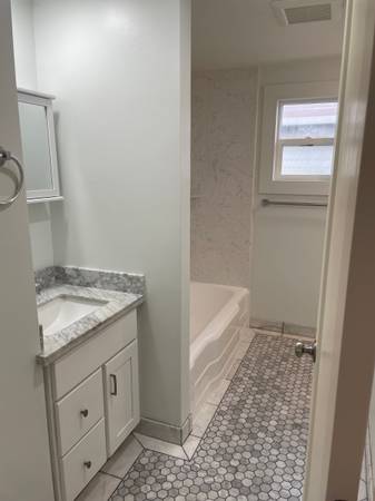 The bathroom has a newly refinished tub and fresh paint.