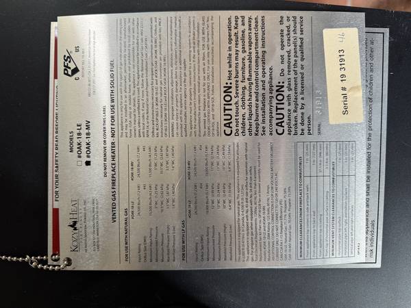 Standing gas fireplace/stove. KozyHeat brand, Model is Oakport 18. Direct vent - no chimney needed. Steel frame. 23" wide, 27" tall, 17" deep. Still works just fine - I'm getting rid of gas entirely...