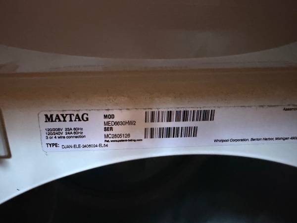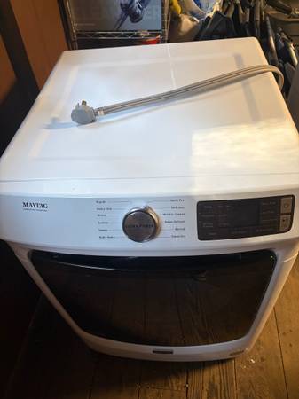 Used 220 V electric Maytag dryer. Good cond. Price is firm. Has small dent on top, which has no operational impact.
