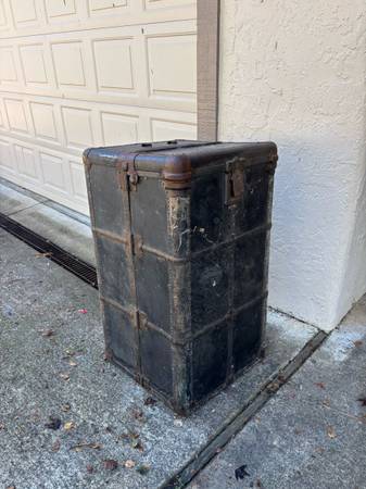 Free! This is an old steamer trunk that is partially stripped inside. It has a musty smell but it opens and closes fine and clicks shut.