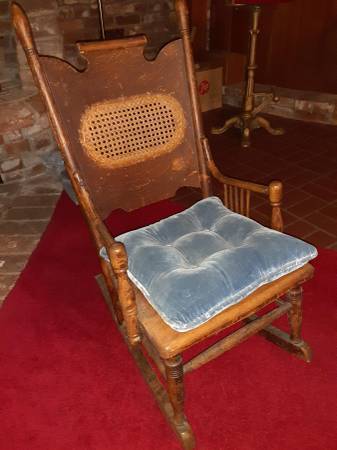 Antique petite wooden rocking chair with cane seat. This vintage rockingchair is solid wood and has the original cane seat and back. Rocker is 27" tall at the top back center bar. 15.5" wide. We have had it 30 plus years and was mostly for decor by the fireplace and at Christmas time. Also very usable as a rocker. $25