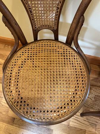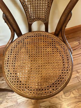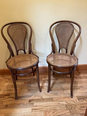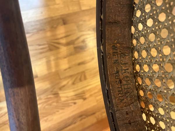 This is a pair of bentwood chairs made by Jacob and Josef Kohn in Austria. Given the maker's mark, they were made prior to 1914. The wood is likely Austrian beech and the seat and back are caned. Please see photos for two small breaks in the caning on the seat back of one of the chairs. The other is in excellent condition. I prefer to sell them together. However, if you only want one, the chair with the break in the caning is $600 and the other is $800.