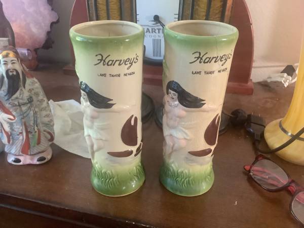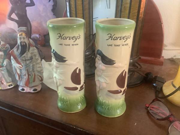 These are from late 60’s, Harvery’s Resort Hotel Casino- Top of the Wheel bar restaurant had Polynesian theme and these were their mugs/glasses for Mai Tai’s etc.