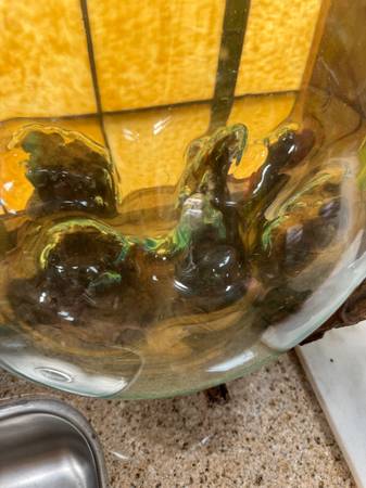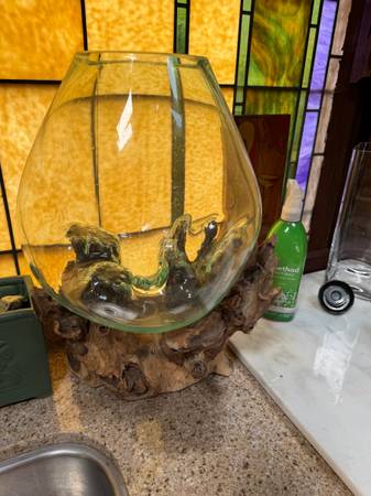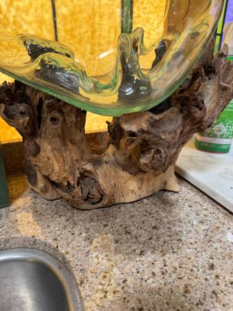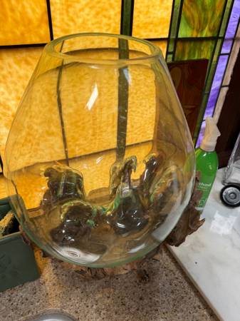 Large hand blowing glass terrarium on driftwood pedestal.…. call