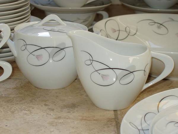 This is a fabulous 96-piece set of beautiful mid century modern SANGO glazed white china with pink scattered flowers, calligraphic black ribbon swirls and pale gray ovals with a shadow of blue, throughout the collection of pieces.