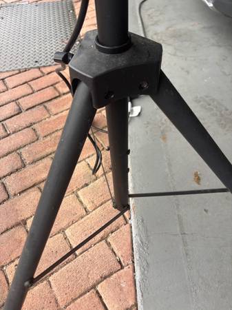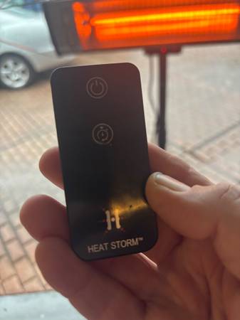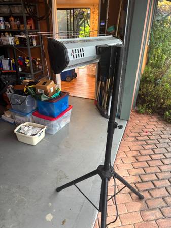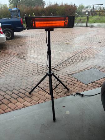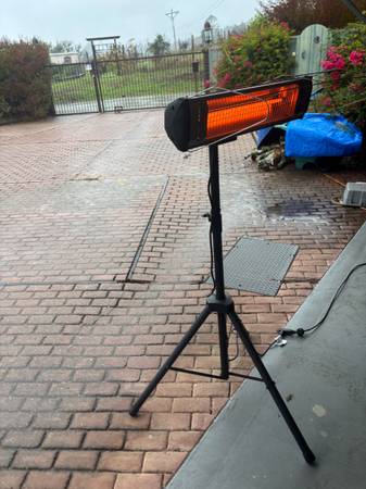 Powerful portable heater - great for patio and outside use, but also will work in large rooms, etc. Quartz element puts out a lot of radiant heat. Unit runs on 117VAC and comes complete with a remote control, adjustable tripod stand that allow a maximum height of approximately 6'. Looks and work like new - used only a couple of times during parties on our enclosed outdoor area.