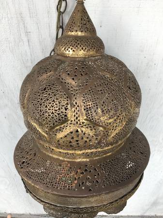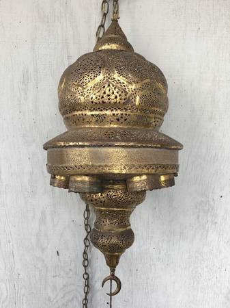 Exotic Vintage Moroccan Lantern Swag Lamp. Intricately detailed and pierced brass. 6 lights. Long swag chain/ cord. 30”H x 13”D Newly rewired. The lamp turns on by twisting the moon at the bottom.