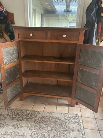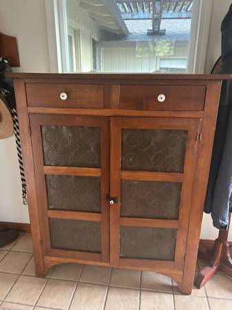 Old oak pie safe for sale with some damage door swing open and shut has some damage in the front right corner of the door as well as the back top right side has some damage still in great shape...