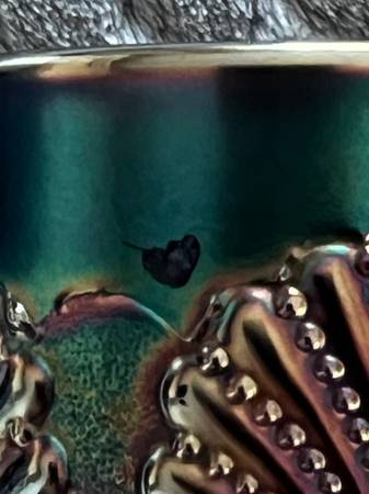 This beautiful mug has two imperfections. A small heart-shaped chip on the body (see second photo) , and another on the base, but that one is barely detectable.