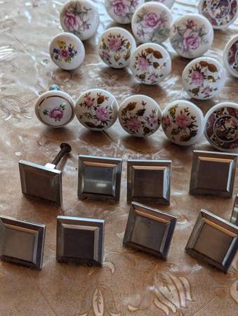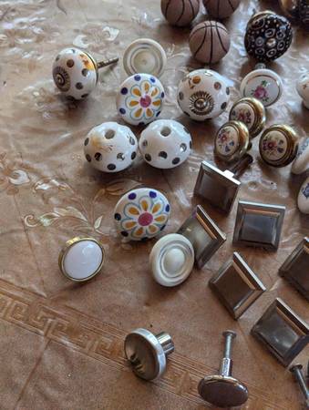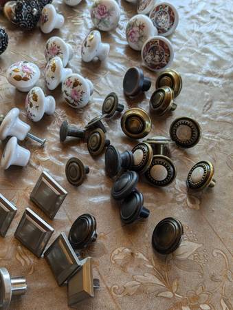 For Sale 50 antique Cabinet door knobs different design and shape $ 2 each.