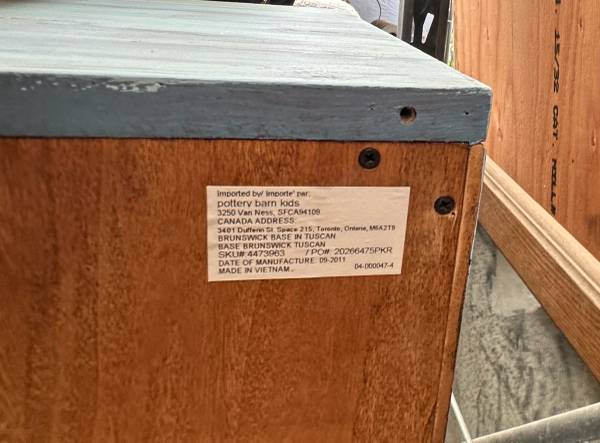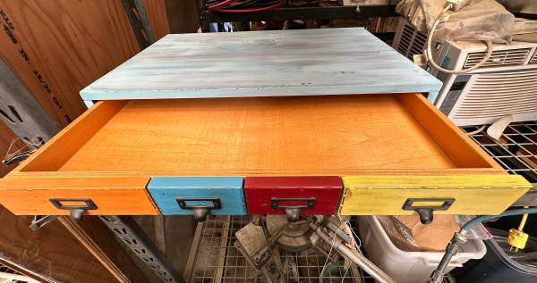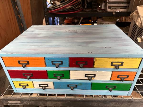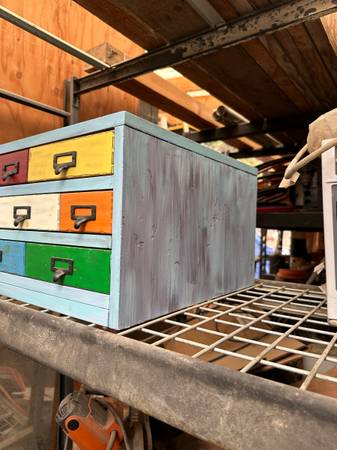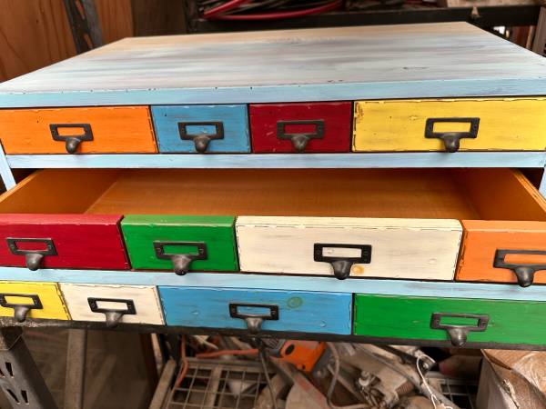 This is a Pottery Barn Kids small chest of drawers. It has TWO drawers even though it has the multicolored drawer-looking sections. It has the old fashioned library pull handles like the card catalogs did. Fun for a kid or artist or anyone who loves color blocking. Very clean, has been in outside covered storage just about week, not rained on and not getting sun. It originally came with brown 4 cubbie cube type shelf that sits on top but we are keeping that part.