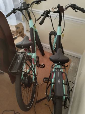 They come with the original charger and batteries. ( they have been ridden maybe 5 hours)!!! I bought them brand new from World of Wheels in Modesto. They are small-med, step threw, aqua color, new-like condition all the way around (tires, hydraulic brakes, lights etc.) Pace 500 3rd generation, this is the Cadillac of E-Bikes!!!!!