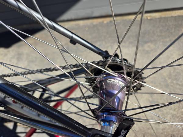 Rocklobster 56cm single speed, was oriainally built up as a drop bar cross bike then converted to a single speed leaving the cassette and chainrings with a singulator. No shifters
