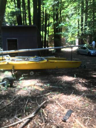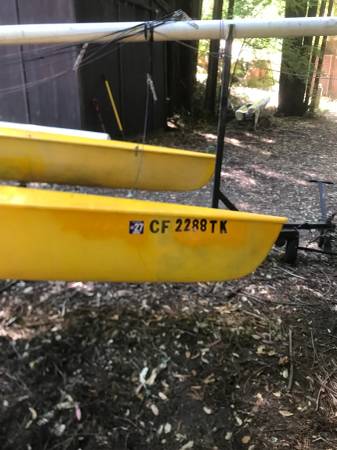 Ready to sail--fast and fun. Priced to sell immediately. Comes with trailer, new tires plus new spare. Boat and trailer recently updated by DMV. Must pick up in Boulder Creek, Ca. Call Craig at .
