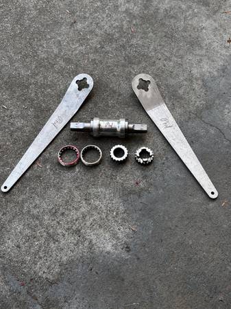 68 / 73 titanium bottom bracket. 1.37 x 24 British mounting screws. 18 spline mounting tools. 125mm axle length. Excellent condition. Ready for your vintage build. Willing to separate.