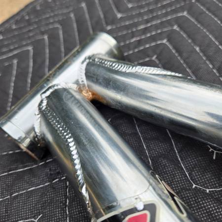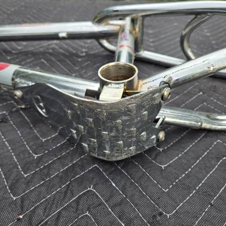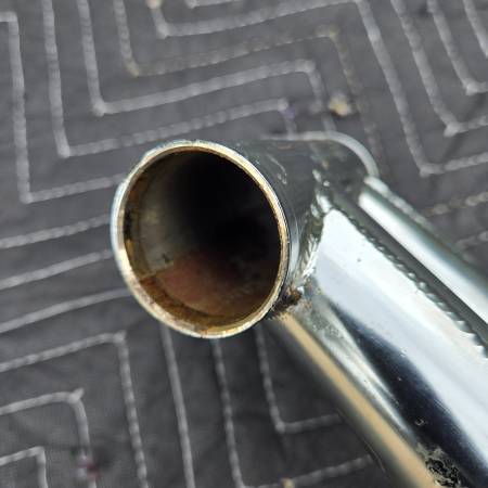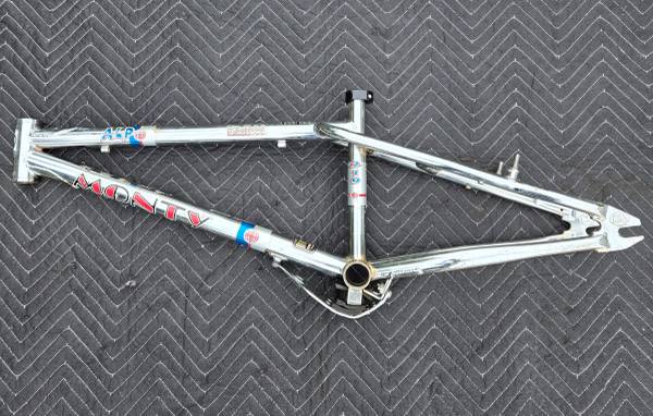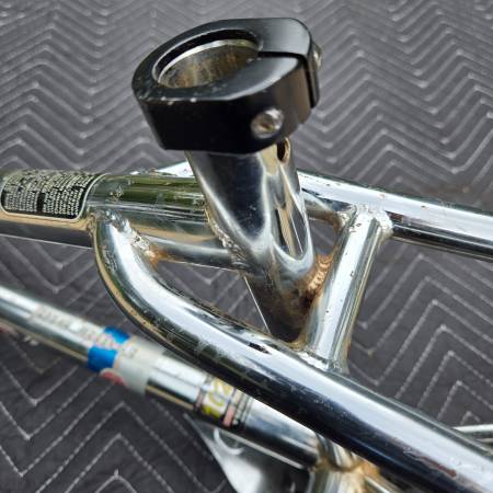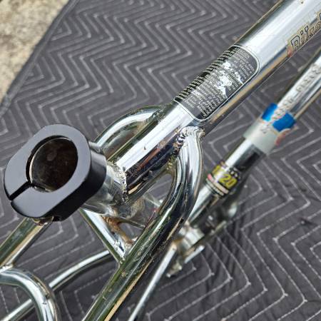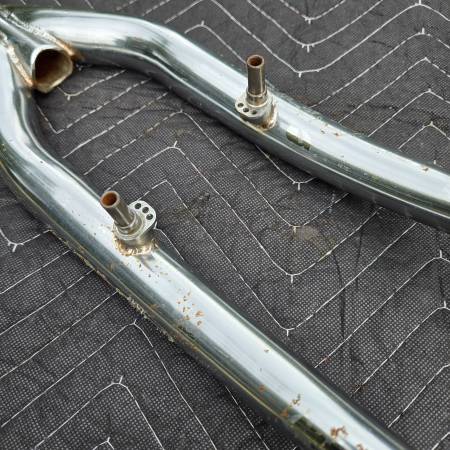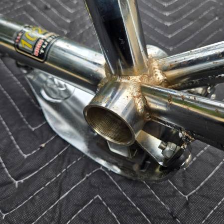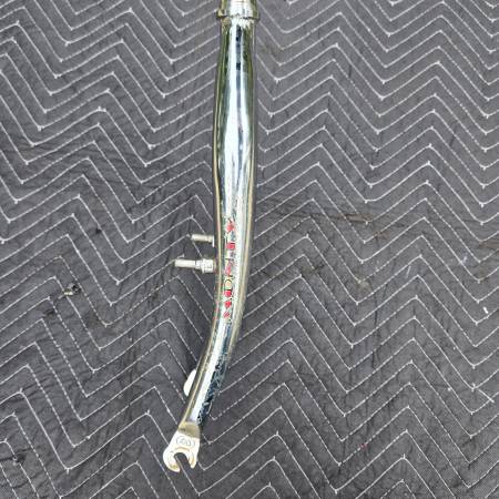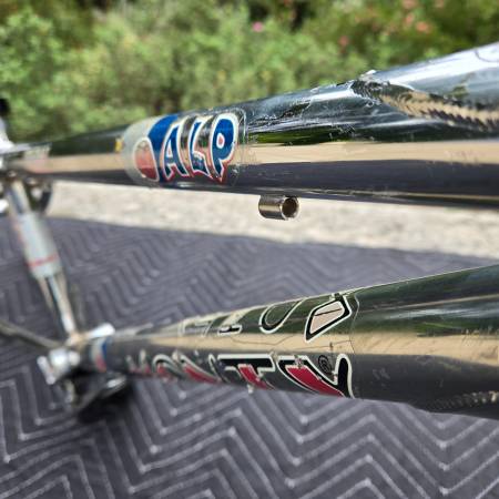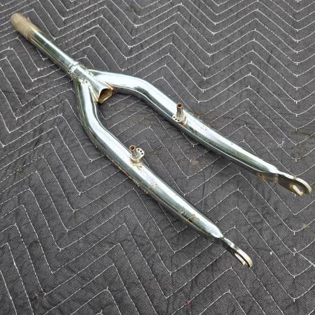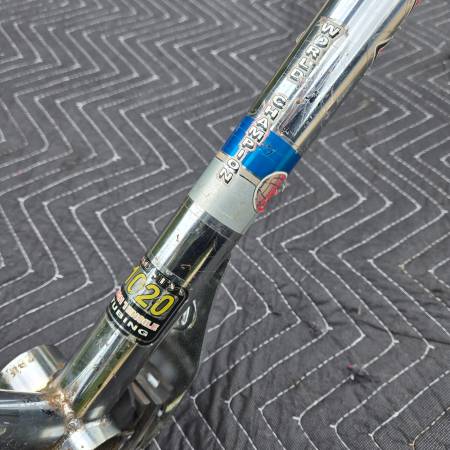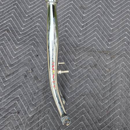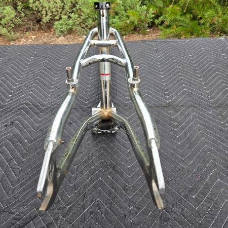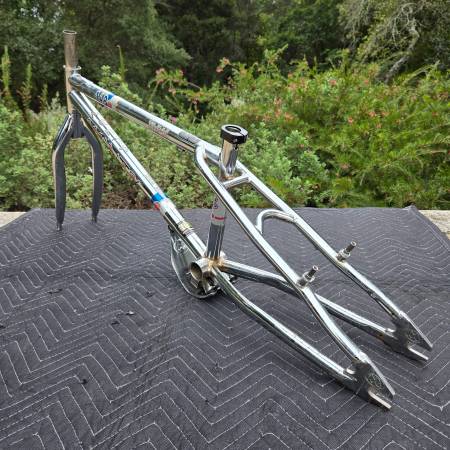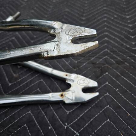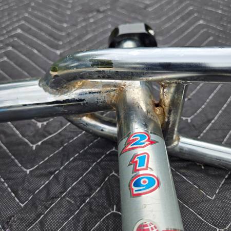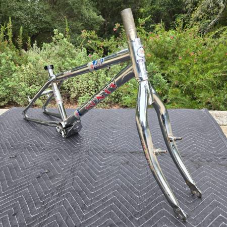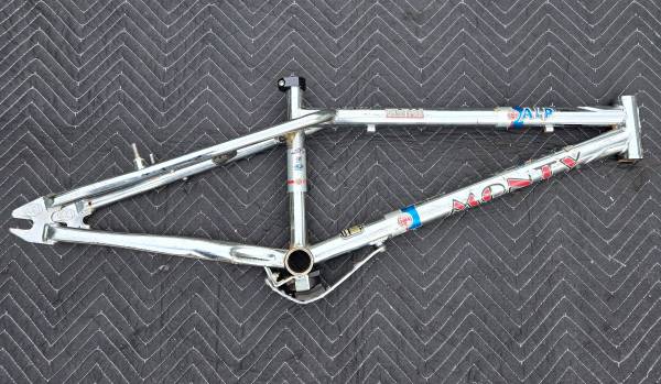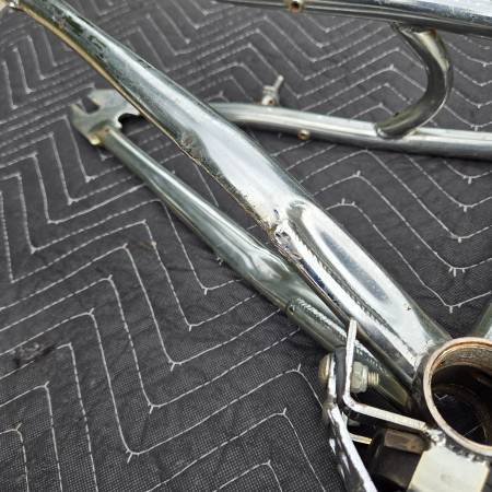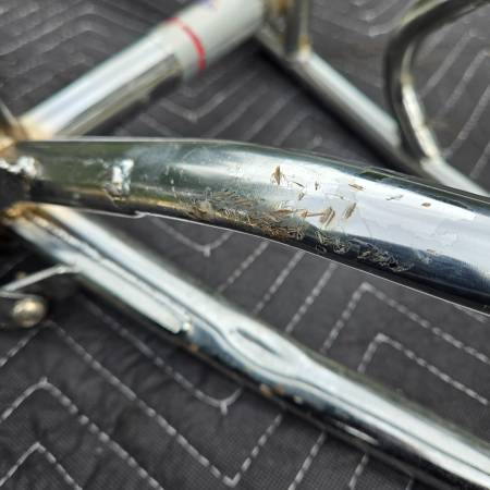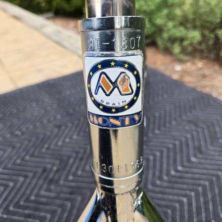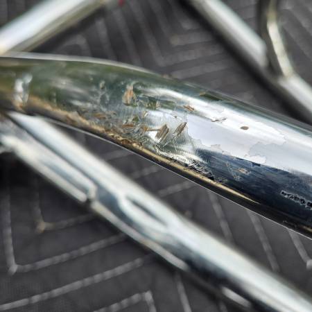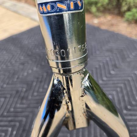 I'm selling a used Monty BI-1307 219 ALP bike trials frame and fork. It's in rider condition with scratches all over it. I noticed dents on the chainstays. The larger one is on the right chainstay. The frame and fork has rust. I tried to remove some of it. It looks like there's clear coat over the chrome. I thought it was haze in the chrome, but can see in some areas that it's scratched off exposing brighter chrome. I can provide more pictures if needed.