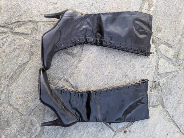 Women's black leather lace-up knee-high boots from England, with pink lining.