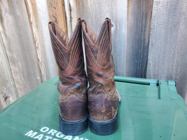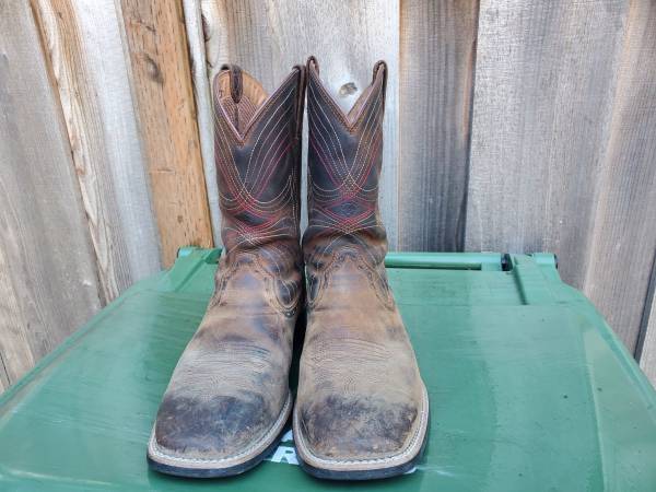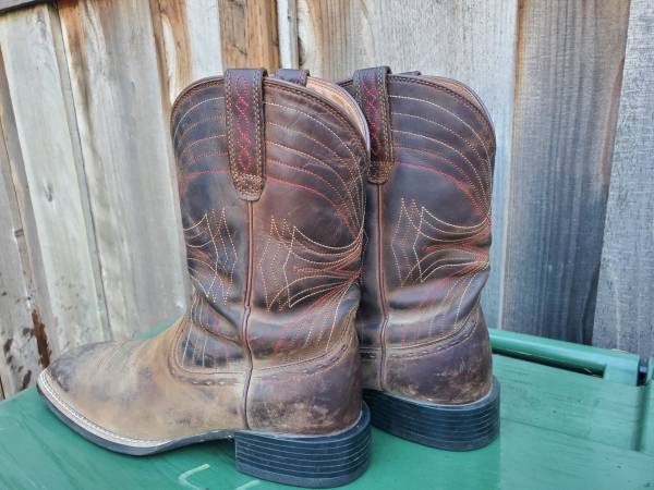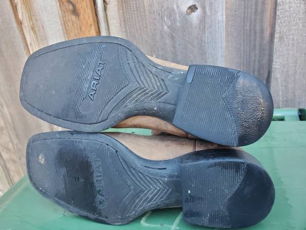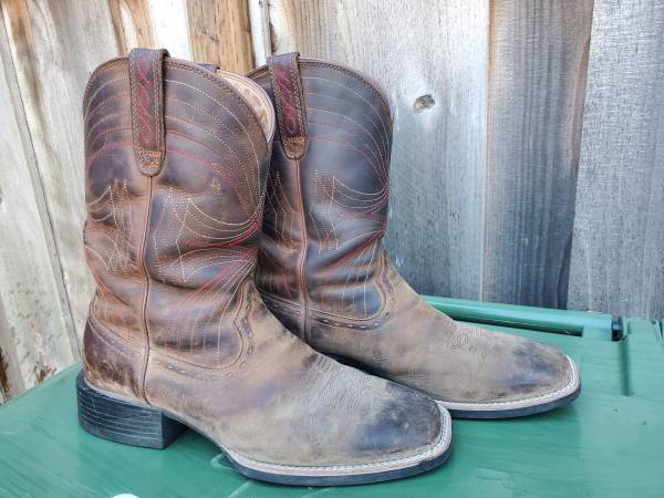 these boots are not worn much. see photos. they have some dust on them. some people really like that, others don't. so you could polish them up and they would be all shiny..... but why would you? look authentic for crying out loud! they have the Ariat insole and it's in fine shape. the leather is super nice and soft and you will look great in these boots and ride on cowboy!