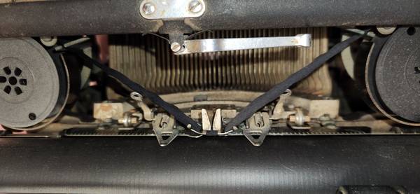 This typewriter has the later upgrades including backspace, lateral paper guides, and a two-color ribbon selector.