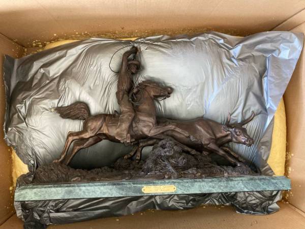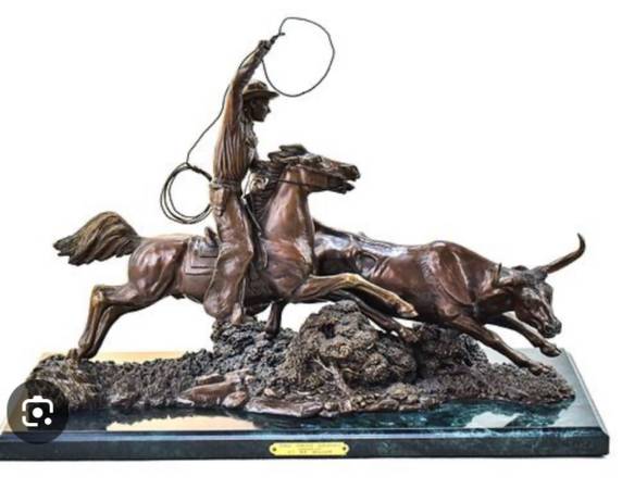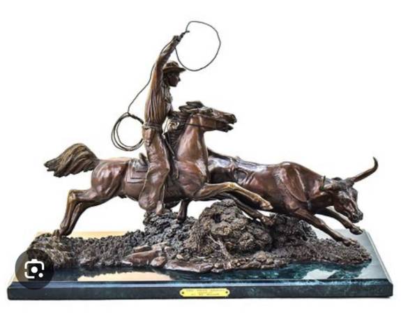 The Herd Quitter Bronze inspired by Charles Marion Russell is a large, handmade sculpture in bronze casting. This 1982 1st edition statue depicts a Western-themed scene, showcasing the unique style of Americana artistry. With a size of 24 inches in length and 14 inches in height, this piece exudes a sense of authenticity and craftsmanship, making it a valuable addition to any art collection. The intricate details and quality materials used in the production of this sculpture make it a standout piece