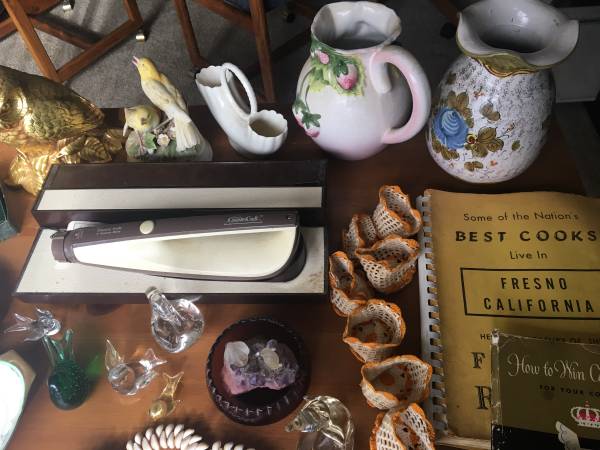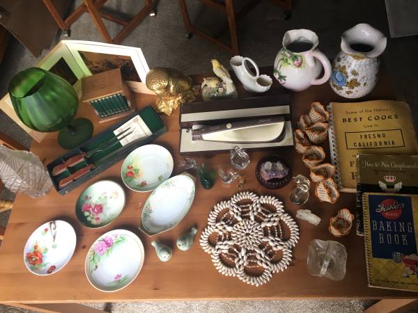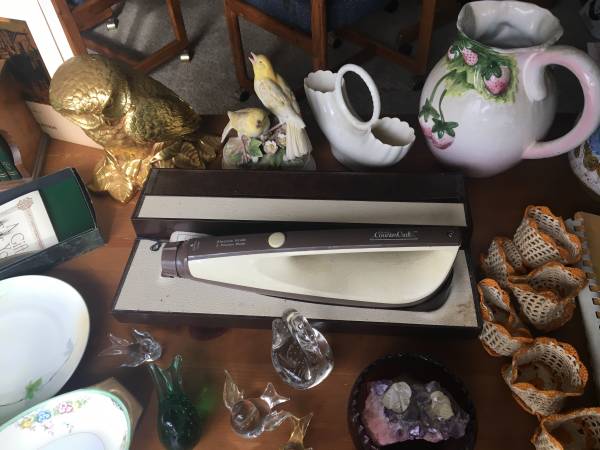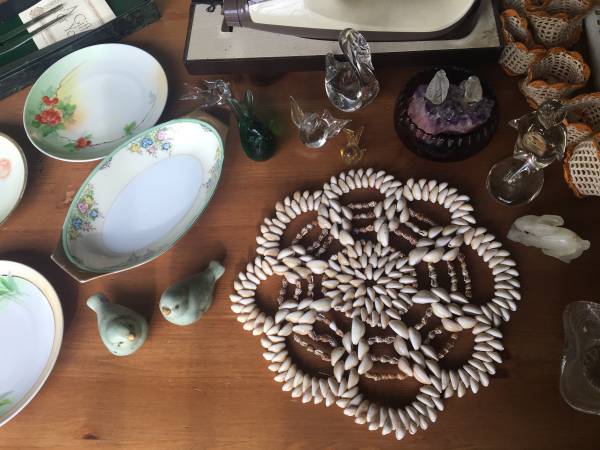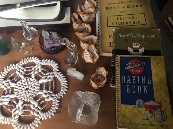 Hand blown glass! 1941 cookbook. Lenox. Hand tatted cup holders. Hand beaded shell doily. Carving knives; electric and manual. Take all that is seen on the table. $50. Email only. Local delivery...