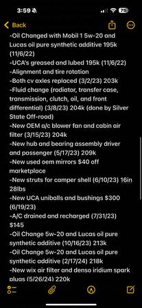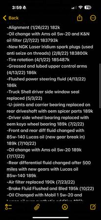 - RECENT SERVICE DONE (LAST 5k MILES): valve cover gasket, coolant bypass hose, serpentine belt, oil and filter change, rear drum brakes resurfaced and new shoes, new oem cv axles, rear axle resealed, new rear axle seals, and drive shafts greased.