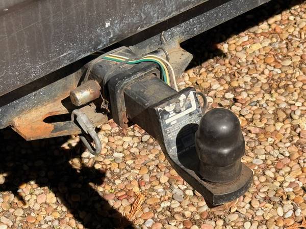 Comfort features include power steering, power windows, power locks, tilt steering wheel, and cold A/C. The sound system is an Alpine AM/FM single CD player (older but quality) with a 1/8” aux input. It also comes with a towing package (standard ball hitch, missing key for hitch lock) and a 4‑pin connector for trailer lights. Tires are in excellent shape with lots of tread.