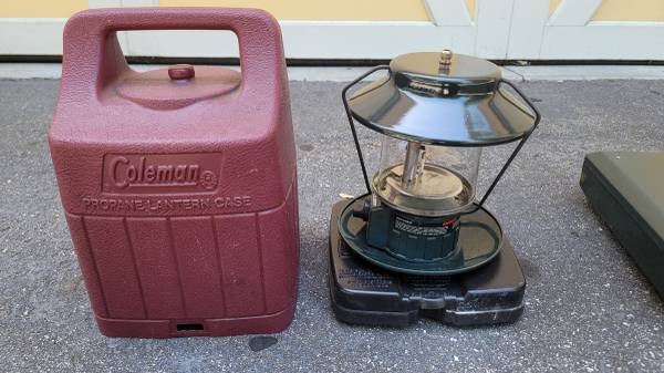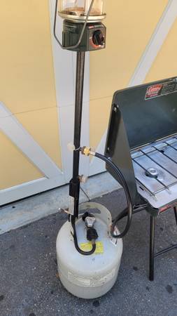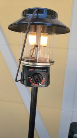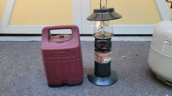 The 2-mantle lantern has an electronic ignition for easy lighting and can also run from a 1lb propane bottle or 20lb tank. It has a wide base for stability when using a 1lb bottle, and a large handle to hang it from or carry even when it’s lit. It folds down to fit inside a carrying case.