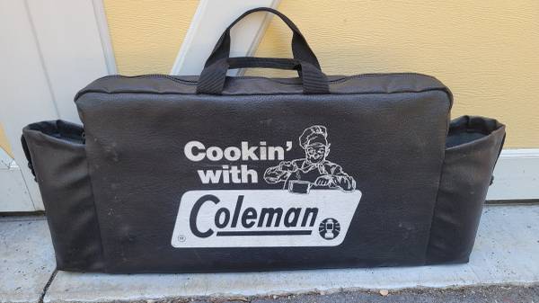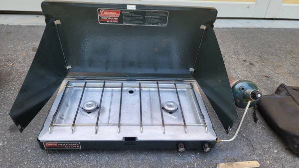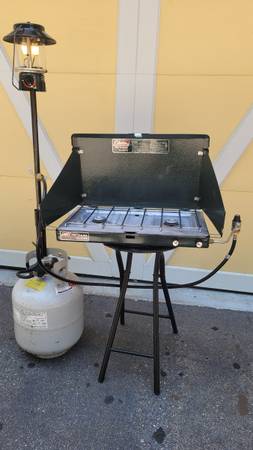 The stove runs off a 1lb propane bottle (the little green ones) or a 20lb tank with the included distribution tree and extension hose. It has up to 20,000 total BUTs of cooking power from 2 independently adjustable burners with wind block shields. It folds down and stores in a convenient carrying case that also has pockets for 2 1lb propane bottles.