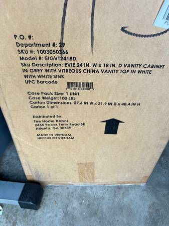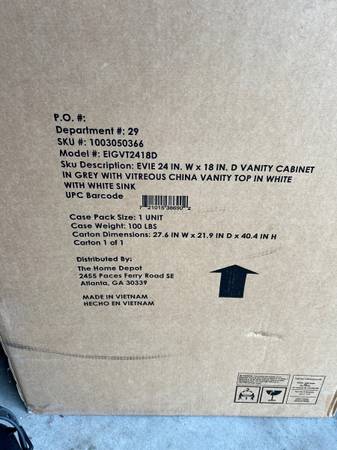 The Home Decorators Collection Evie 24" W x 18" D Gray Vanity (model EIGVT2418D) is a fully assembled, freestanding vanity with a white vitreous china top and soft-closing door/drawer.