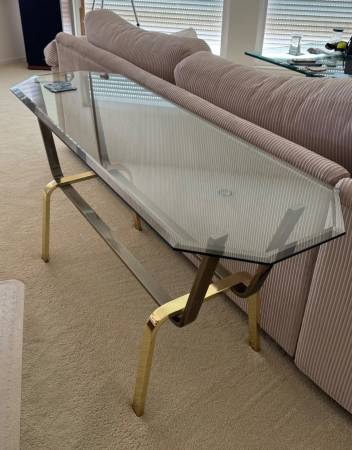 Coffee table and sofa table. Both with glass tops in excellent condition. Bases in good condition - both have some metal corrosion due to humidity. Coffee Table: 30”W x 54”L x 16”H Sofa Table:...