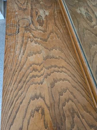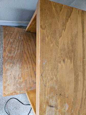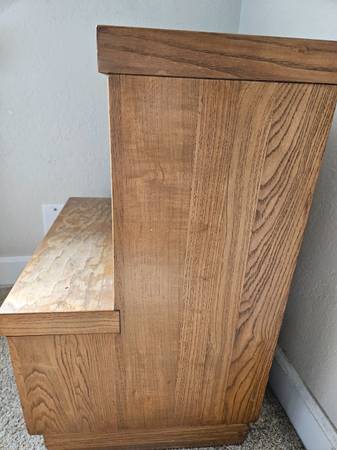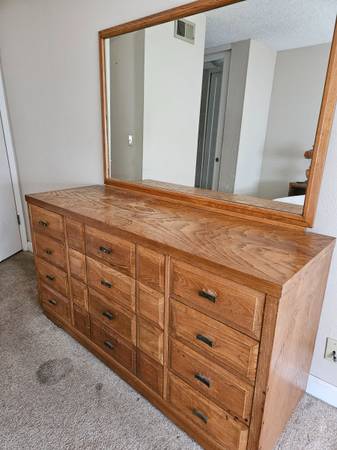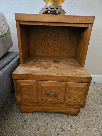 All wood - vintage LA brand - 1950s Solid condition - needs refinishing. Dresser - (5' long 20" W 33" tall) with detachable mirror (36x52") 2- end tables (18"W 15" D and 26" Tall) Must move yourself...