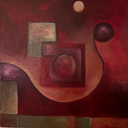 This hand finished vibrant oil painting on stretched canvas measures 16” x 16” It’s what we call an Avant Garde Abstract painting style, or Geometric Abstraction. Crisp shapes are painted against a...