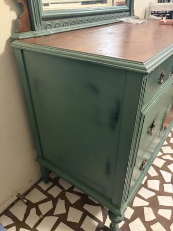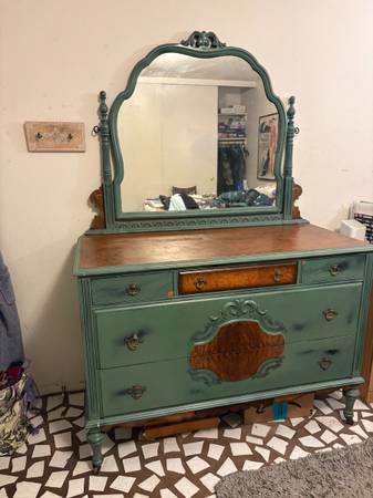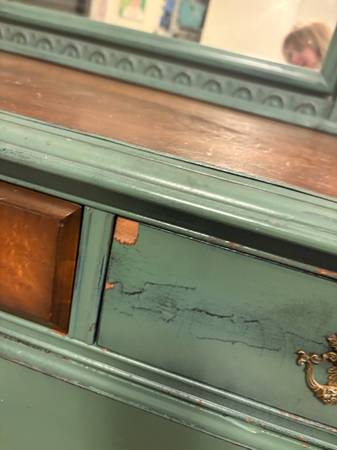Beautiful wood dresser. Teal paint/ distressed/ antique look. 5 drawers. Decorative carving and pull knobs. Vanity mirror. On wheels. Mirror detaches.