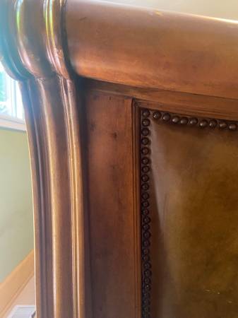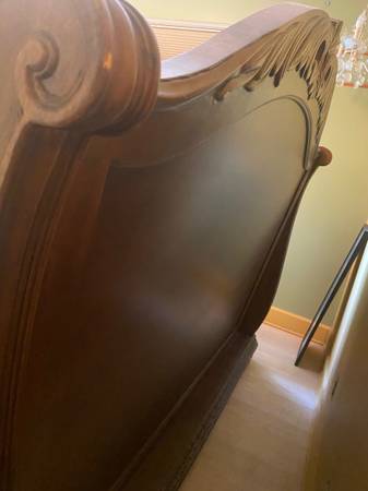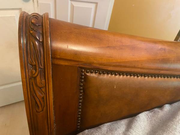 High-end Beautiful quality wood King-sized bed, with leather head and foot boards. One of the kind. Classic design. Valued at $7000+. Easy Disassembles and reassembles. Cash only. Great value. Investment grade. Included for free are sets of King beddings. First pickup, first get.