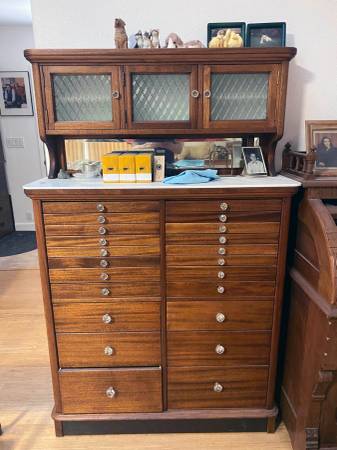 Includes a bunch of original glass dental trays. Has some long ago repaired cracks in the top outside cabinets.