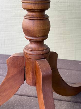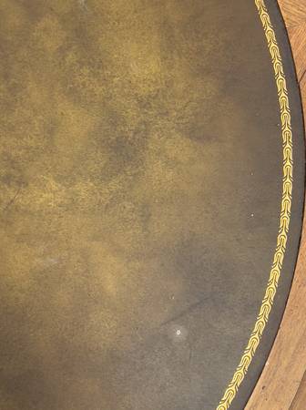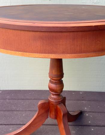This sweet, vintage tea or card table has 3 legs, claw feet, possibly leather tabletop. Lovely handles on the side. Quite light. Height: 27" Diameter: 26" Thanks for looking!