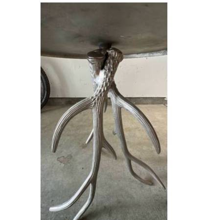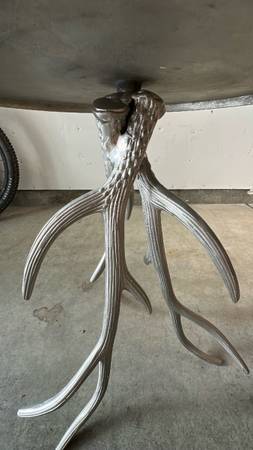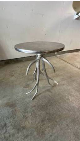 Great condition. Can be used as a side table or accent table. Very sturdy and durable aluminum. The legs of the table are crafted to represent a pair of antlers. Very unique. The piece measures 21.5 inches heigh with a 16 inch diameter. Originally from a local shop in Santa Cruz that closed a few years ago.