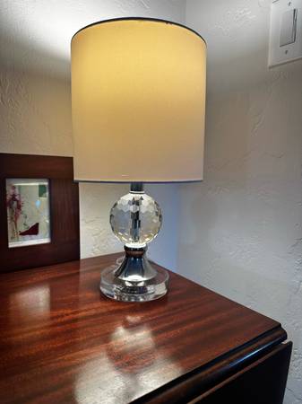 Excellent condition. No flaws. 18” tall Combined metal and crystal stacked bases create a lamp that is both stylish and sturdy. Drum shades is 9 in. W and 8.5 in. tall Pickup in Live Oak near 7th...