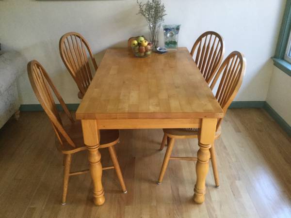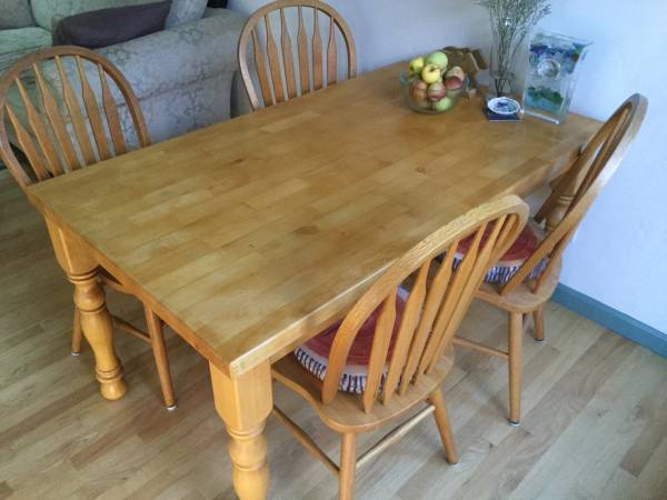Light Alder Wood farm table w/center drawer. TABLE ONLY, chairs not included! Legs unbolt for easy moving. $175.00 or best offer. Pick up only, cash, by appointment. Please no hassles. If aid is up...