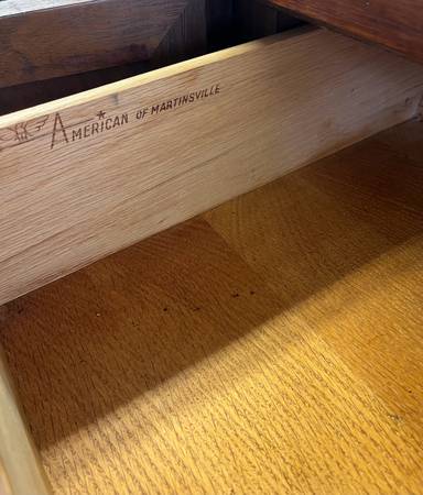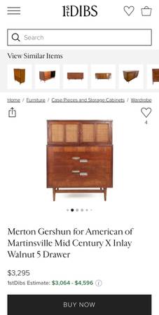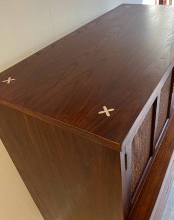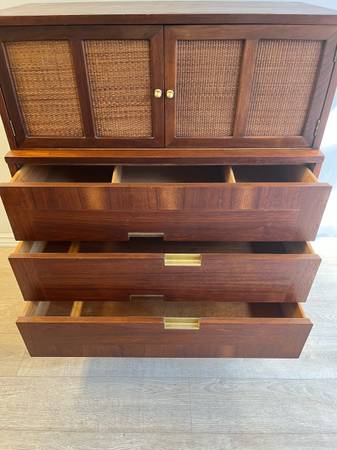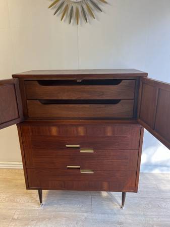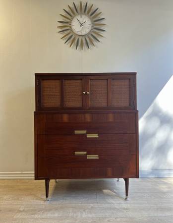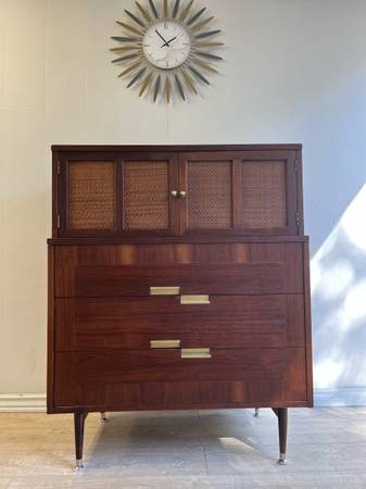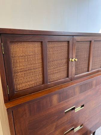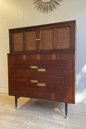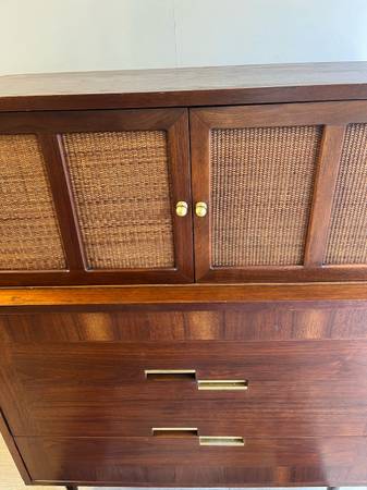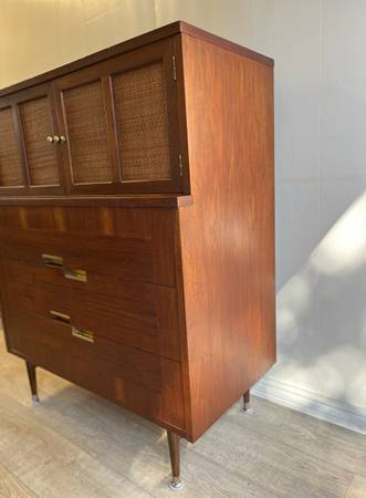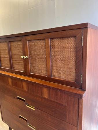 Mid century modern American of Martinsville walnut highboy dresser designed by Merton Gershun. The Accord line of furniture in rich walnut in a deep mahogany color features the signature, inlaid metal X’s on the top and asymmetric handles. On the top are cane front doors opening to reveal two interior drawers. The bottom section has three more dovetailed drawers, the first of which has dividers. The case sits on tapered legs. Very good vintage condition. The top has been refinished and the rest of the dresser is refreshed and rejuvenated with only minor cosmetic blemishes.