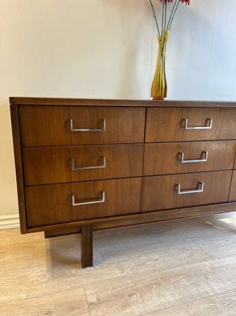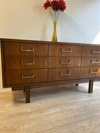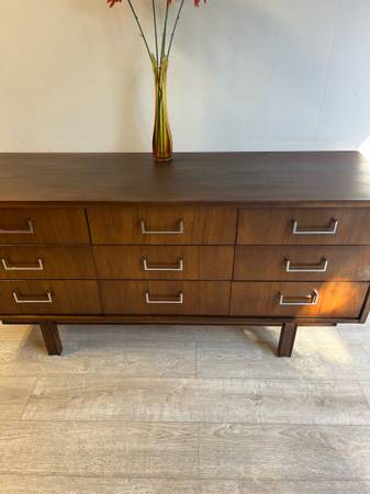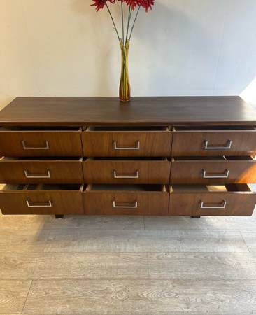 This stylish mid-century modern 9 drawer dresser boasts clean modern lines and vintage walnut finish- sleek chrome drawer pulls add to the mid-century charm of this spacious 9 drawer dresser and make it the perfect addition to any bedroom setting.